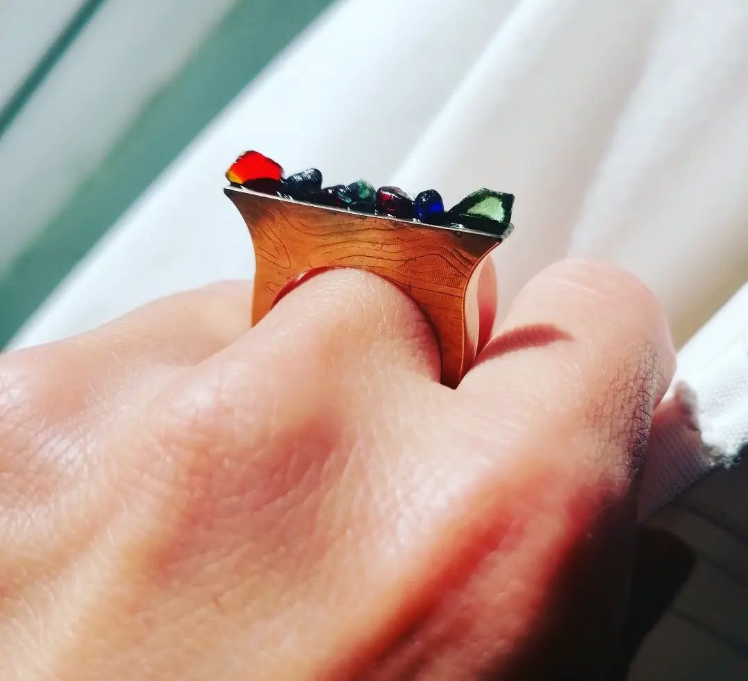 Welcome to Sunshine and Happiness, a small London jewellery studio where organic design meets the colours of the Earth. I create handcrafted silver pieces featuring sea glass and vibrant enamel, each one made by hand using traditional silversmithing techniques.