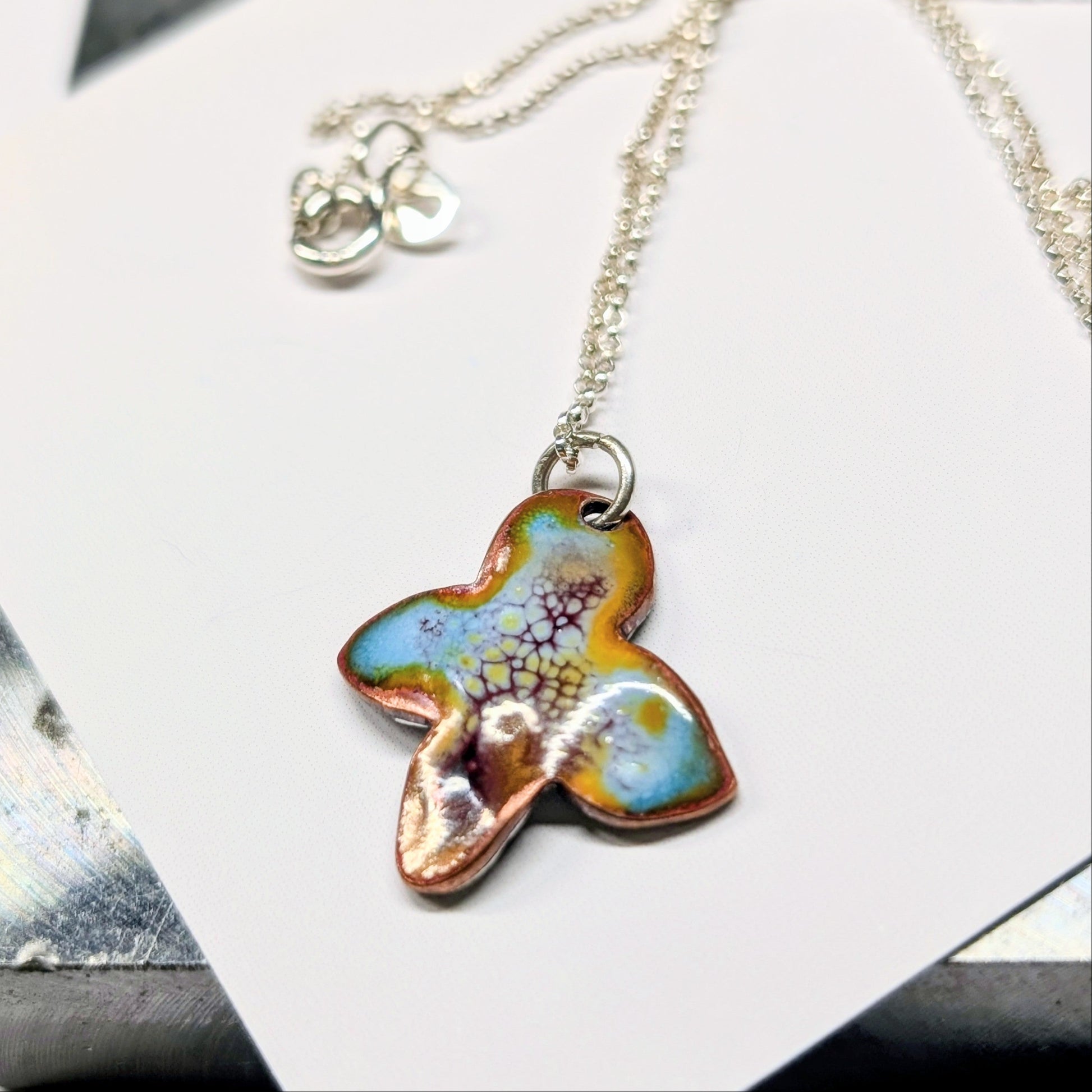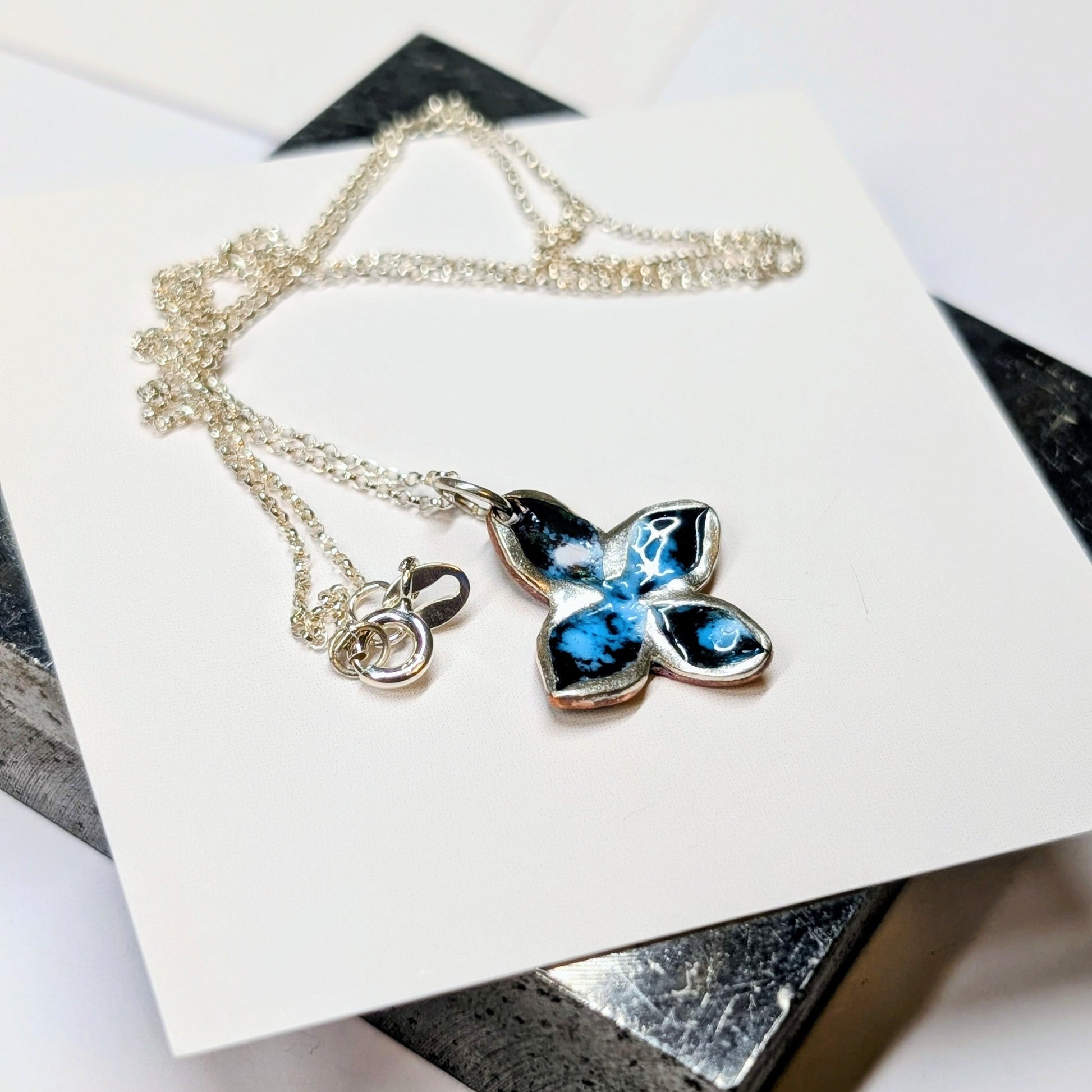 This necklace features a delicate silver chain paired with a handcrafted flower-shaped pendant. The pendant is made from copper with enamel applied to its surface, giving each petal a glossy, glass-like finish. The deep blue and black tones with organic, cloudy patterns and touches of lighter sky blue, creating a sense of depth and movement across the petals.
