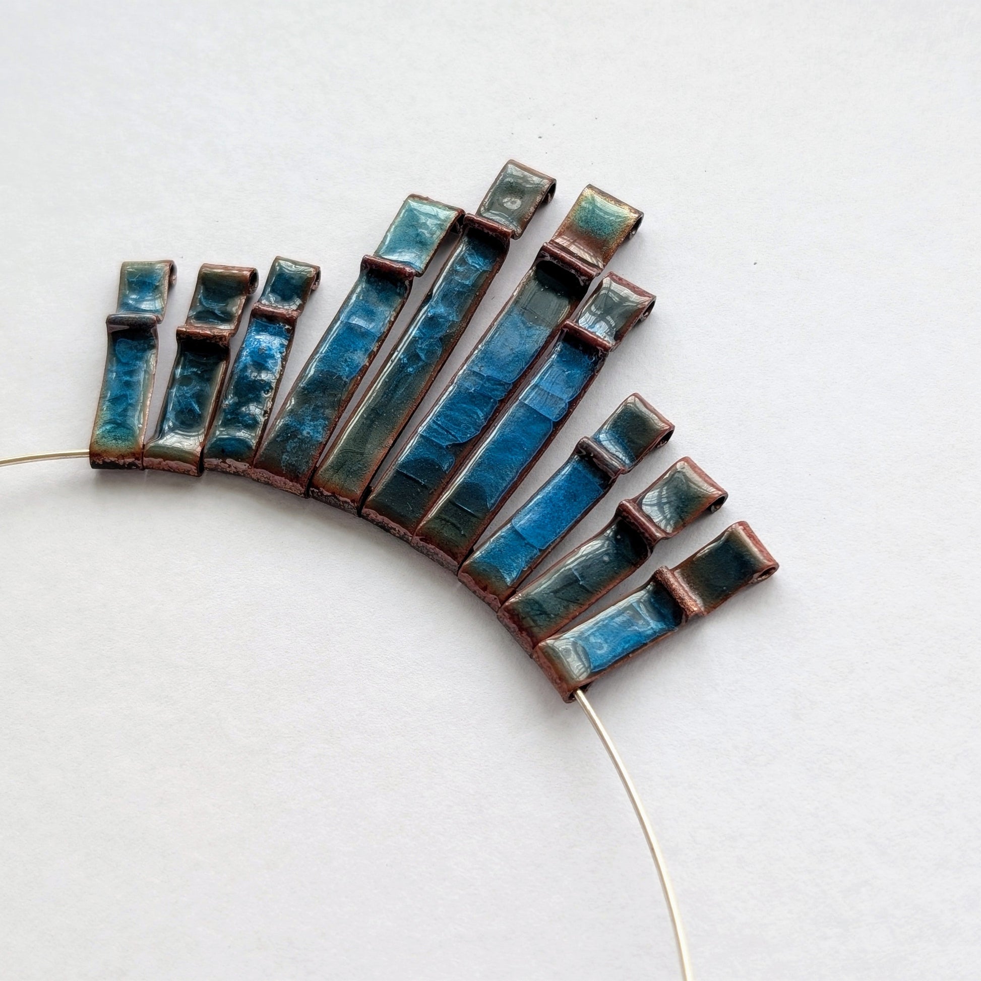 Each bar is coated in enamel in shades of deep blue and teal, with subtle shifts in tone and luminosity that catch the light beautifully. The edges of the copper provide a warm contrast to the cool enamel, giving the design both depth and an artisanal feel.